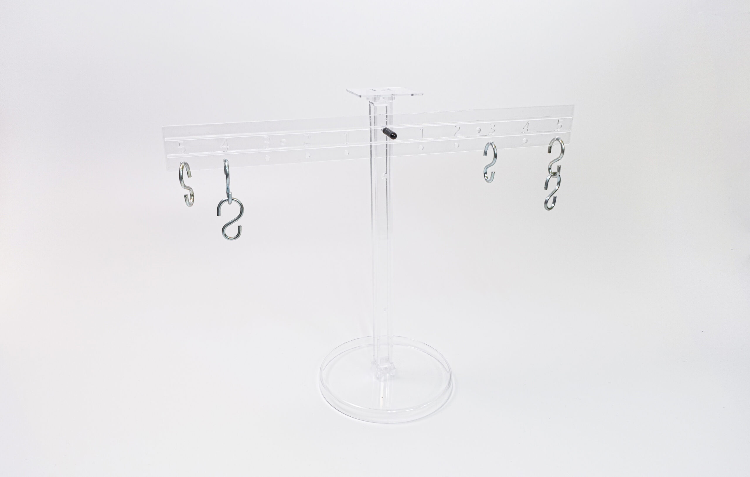 てこ実験器におもりをつるし、つりあいの法則を考察します。