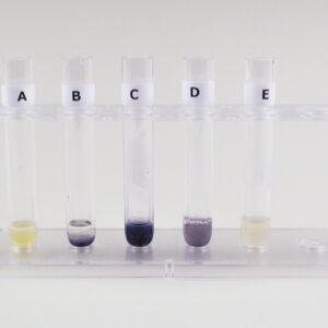 でんぷん水にヨウ素液を滴下すると、ヨウ素でんぷん反応によってヨウ素液の色が黄褐色から青紫色に変化するようすを観察します。